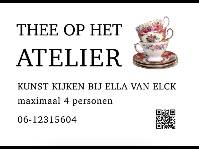 Er zijn zóveel schilderijen van Ella's hand die het waard zijn aandacht te krijgen. Haar atelier hangt vol met grote en kleine schilderijen, objecten, kunstvoorwerpen en meer, dat het haast wel een museum lijkt. Tijdens 'Thee op het atelier' legt Ella uit hoe zij werkt, hoe zij haar inspiratie opdoet en gestalte geeft, hoe zij haar ideeën uitwerkt en hoe zij lesgeeft. Zij vertelt het allemaal.